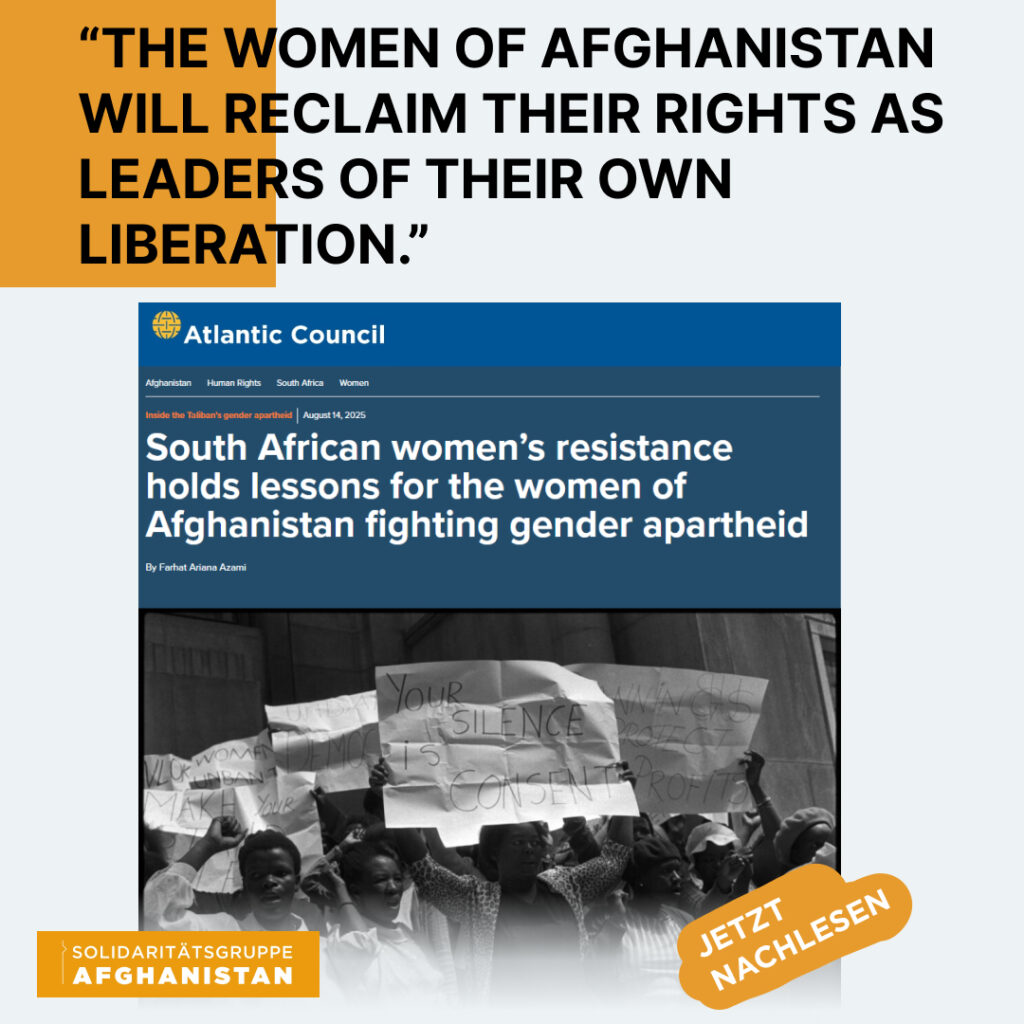 Das südafrikanische Apartheids-System ist in den 1990ern in Folge massiven Widerstands der schwarzen Bevölkerung überwunden worden. Die aktuell stattfindende systematische geschlechts-bezogene Unterdrückung durch die Taliban ist noch nicht als Verbrechen gegen die Menschlichkeit anerkannt. Dafür kämpfen Aktivist*innen weltweit, wie auch wir von der Soligruppe, und fordern starke Unterstützung des Widerstands.