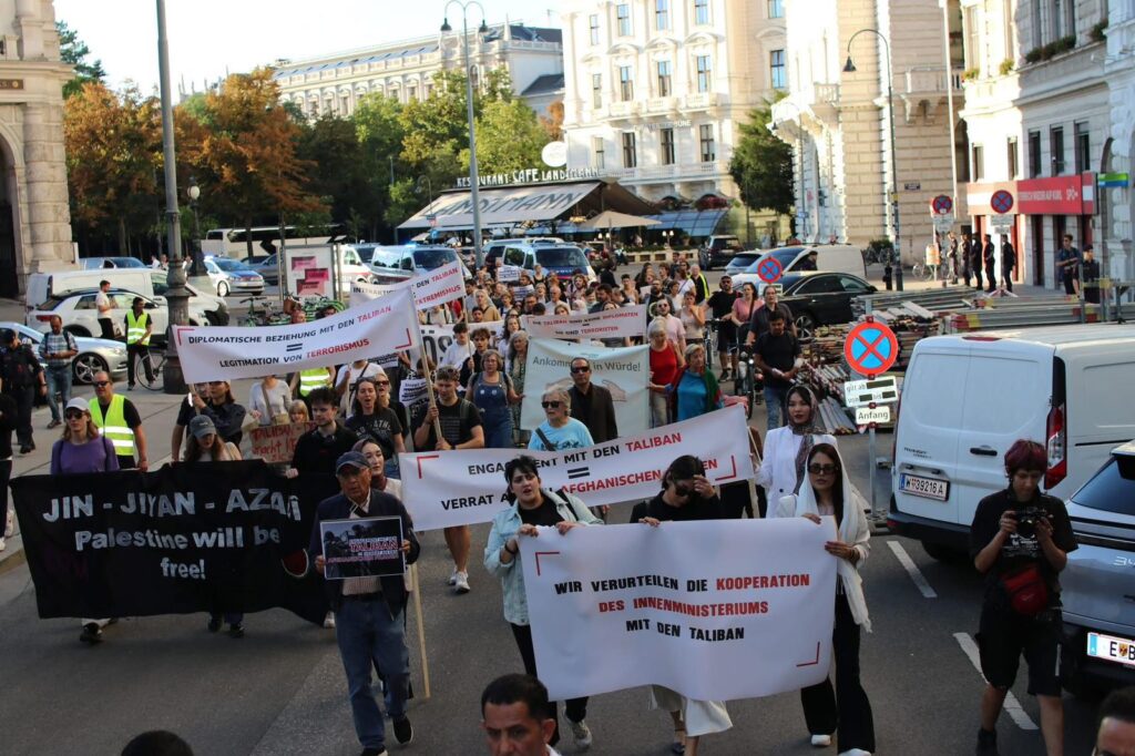 Die gestrige Demo, an der sich mehr als 20 Organisationen beteiligt haben, war ein großer Erfolg. Mit lauten Sprechchören, starken Reden und viel Sichtbarkeit auf wiens Straßen haben über 200 Demonstrant*innen eines ganz klar gemacht: Die Deals mit den Tailban müssen sofort gestoppt werden! Begonnen hat die Demo mit einer Kundgebung vor dem BFA am Hernalsergürtel, zog dann durch den 8. und 1. Bezirk, und schloss mit einer Kundgebung in der Herrengasse vor dem Innenministerium ab.
