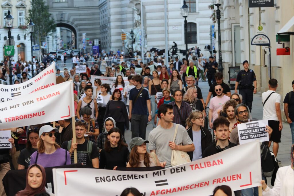 Ausgangspunkt des Protest war der Empfang von Taliban-Funktionären in Wien durch das österreichische Innenministerium. Nach Gesprächen von Seiten des Innenministeriums mit den Taliban in Kabul Anfang des Jahres, war dies ein weiterer Schritt hin zur Annäherung an das abscheuliche Taliban-Regime. Statt den Rufen nach mehr Unterstützung und Solidarität für die Menschen in Afghanistan nachzukommen, geht die österreichische Politik Deals mit den Taliban ein. Das stellt eine defakto Anerkennung der Taliban als legitime Machthaber dar. Österreich stärkt die Taliban und schwächt gleichzeitig die leidtragenden Afghan*innen.